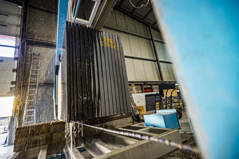 Für die Herstellung von Granitplatten für den Außenbereich werden die Rohblöcke zunächst durch eine Seilsäge in Rohplatten zugeschnitten. Bei der Oberflächenbearbeitung werden die Granitplatte entweder im Schleifautomaten poliert, geschliffen, gebürstet oder in der Flammstraße entweder automatisch oder mittels einer Flammlanze per Hand geflammt – auf Anfrage sind auch weitere handwerkliche Bearbeitungen wie Stocken oder Riffeln möglich. Von dort aus gelangen die Granitplatten zur Fräse oder CNC-Maschine, wo diese auf das gewünschte Format zugeschnitten werden. Beliebte Formate sind 60 x 40 cm oder auch 40 x 40 cm. Wenn Sie auf der Suche nach Granitplatten nach Maß sind, kontaktieren Sie uns gern über das Kontaktformular. Anschließend folgt die letzte Feinarbeit. So erfolgt die Bearbeitung der Seiten und das Fasen der Kanten durch den Seiten- bzw. Kantenautomat, welche die scharfen Kanten abschrägt. Eine Granitplatte entsteht also durch entsprechenden Zuschnitt und durch die Bearbeitung der Seiten und Kanten. Somit werden diese im Gegensatz zu Beton nicht künstlich hergestellt.