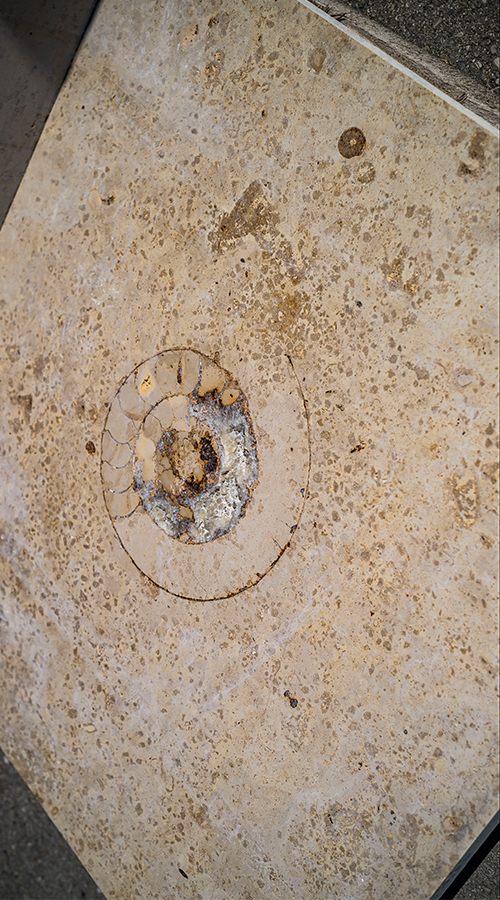 Heute zeigen sich bei der Verarbeitung die bei der Entstehung – abhängig von Lage, Tiefe sowie dem jeweiligen Zuschnitt – entstandenen unterschiedlichen Färbungen und Musterungen, die jeder einzelnen Kalksteinfliese einen ganz eigenen Charakter verleiht. In seiner Beschaffenheit jedoch, teilen alle Jura-Arten folgende Eigenschaften: Der Naturstein Jura weist eine Dichte von 2,6 kg/dm3 auf, besteht zu 91-96% aus Calciumcarbonat und enthält relativ viele Tonminerale. Somit handelt es sich hierbei um einen recht homogenen Naturstein, dessen Minerale schichtartig vorkommen. In ihm befinden sich nämlich Ablagerungen kalkhaltiger Bestandteile, die sich aus natürlichen Lebewesen, also fossile Einschlüsse zusammensetzten. So finden sich beispielsweise Schnecken, Muscheln, Ammonite oder Korallen im Stein wieder. Diese Schichtung zusammengepresster Ablagerungen sowie die Abbauzonen des Jura Kalksteins sind für die Farbgebung des jeweiligen Steins verantwortlich. Und das ist es, was den Kalkstein so besonders macht! Aufgrund dieser faszinierenden Eigenschaft könnte man meinen, er wäre der Prominent unter allen Kalkstein-Arten, die es auf der Welt gibt.